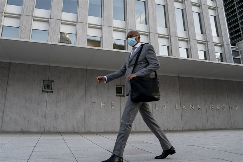Mtembea kwa miguu akipita kwenye makao makuu ya Benki ya Dunia huko Washington, D.C., Marekani, Aprili 20, 2022. (Xinhua/Liu Jie)