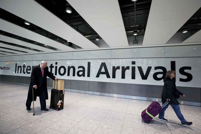 Abiria akitembea katika eneo la abiria wa kimataifa wanaowasili katika Uwanja wa Ndege wa Heathrow mjini London, Uingereza, Machi 18, 2022. (Xinhua/Li Ying)