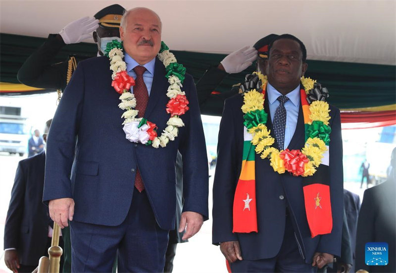 Rais wa Belarus, Alexander Lukashenko (mbele kushoto), akiwa na Rais wa Zimbabwe Emmerson Mnangagwa (kulia), akikagua gwaride la heshima baada ya kuwasili kwenye Uwanja wa Ndege wa Kimataifa wa Robert Gabriel Mugabe mjini Harare, Zimbabwe Januari 30, 2023. (Picha na Shaun Jusa/Xinhua)
