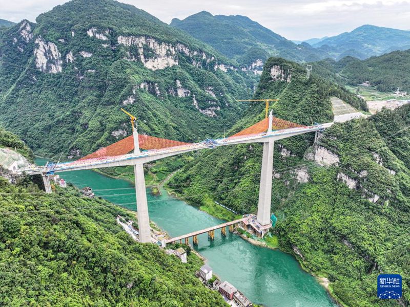 | Picha iliyopigwa tarehe 9, Juni ikionesha sehemu ya ujenzi wa Daraja Kubwa la Mozhai Wujiang la sehemu ya nyongeza ya Barabara kuu ya Chongqing-Hunan ya China. |