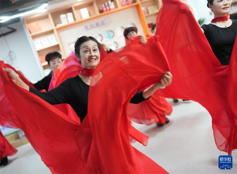 | Wazee wakifanya onyesho la kucheza ngoma katika kituo cha jumuiya ya makazi, Oktoba 10. (Xinhua/Weng Xinyang) |