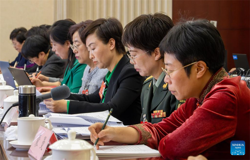 | Washauri wa kitaifa wa kisiasa kutoka Shirikisho Kuu la Wanawake la China wakihudhuria mjadala katika mkutano wa tatu wa Kamati ya 14 ya Kitaifa ya Baraza la Mashauriano ya Kisiasa la China (CPPCC) mjini Beijing, mji mkuu wa China, Machi 6, 2025. (Xinhua/Zhou Dixiao) |